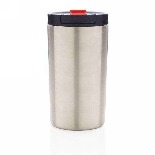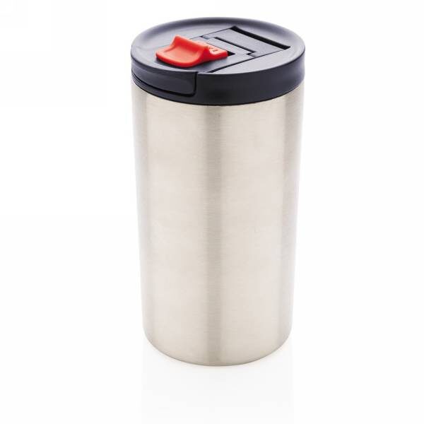 400ml double wall and leak proof push mug. The easy push system allows you to open and close your mug with one simple movement. The silicone ring provides you with a steady grip of the mug.