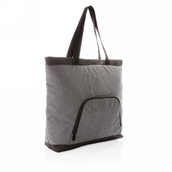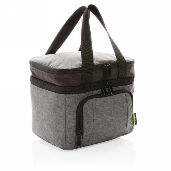 The stylish RPET cooler bag features a large base that accommodates flat packing of ready meals & containers and can fit up to 8 cans. Put your sandwiches in the top zipper compartment and you are ready to go! The cooler bag features a leak-resistant, easy to clean liner. Made of sustainable RPET. Registered design®