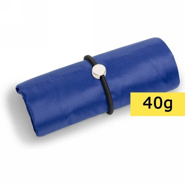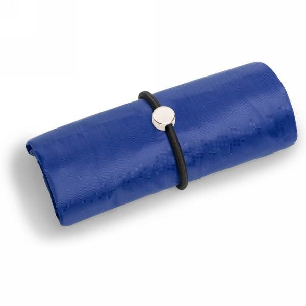 Foldable shopping bag, folded into corner with string and plastic stopper