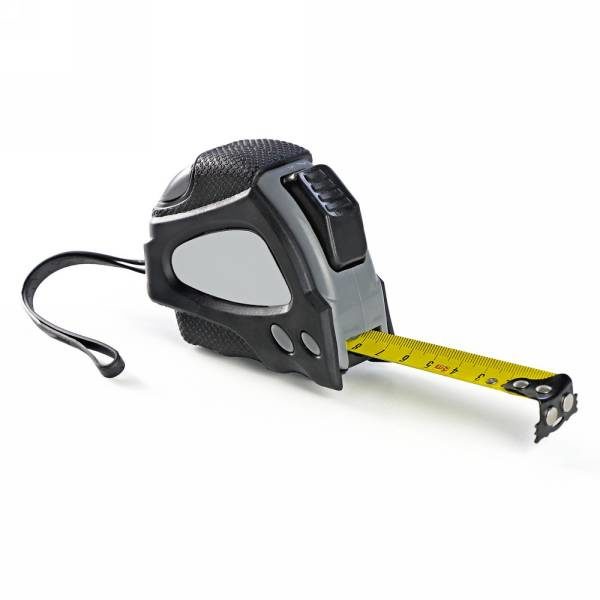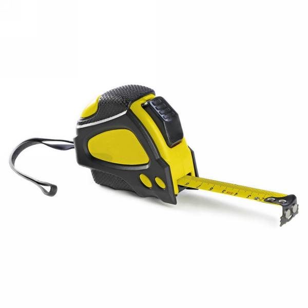 5M/19mm measuring tape, with carabiner, grey ABS case with black TPR grip, black belt clip, black self-lock button, black end hook with 2 strong magnets, yellow tape, matt silver PVC sticker. Registered design®