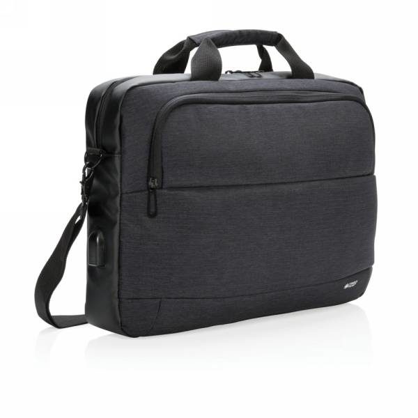 Fashionable 15” laptop bag two tone polyester with PU. Designed with one large main compartment for your laptop and one front compartment. Connect your powerbank easily to the integrated USB charging port and charge your phone or tablet on the go. With shoulder strap and trolley strap on the backside.