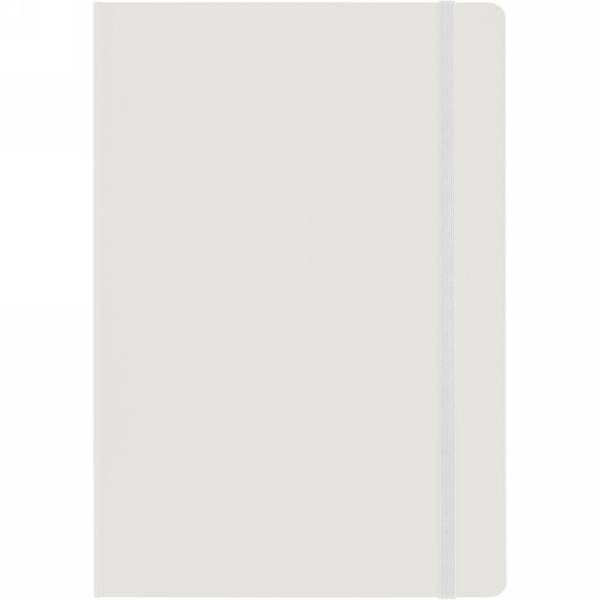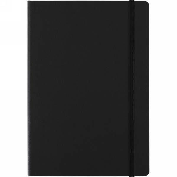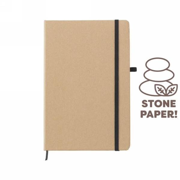 Notebook (approx. A5, 80 lined sheets made of stone paper), hard cover made of craft paper, elastic band for closing, pen loop. Stone paper is made of mix of 80% calcium carbonate and 20% HDPE, which makes it resistant to splashing, dirt and tearing. The product is environmentally friendly, because water and wood are not used during production.