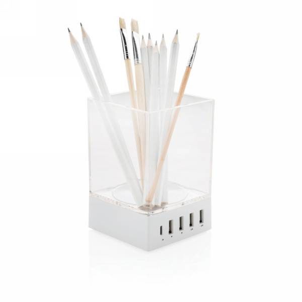 Keep your desk clean and your devices charged with this modern desk charger. Comes with 4 USB(4.8A) ports and one type C 2.0 port to charge the latest generation mobile devices. With blue indicator light to indicate the item is charging. The pen holder is made out of PC and the charger out of fireproof ABS. With 1 metre EU charging cable.