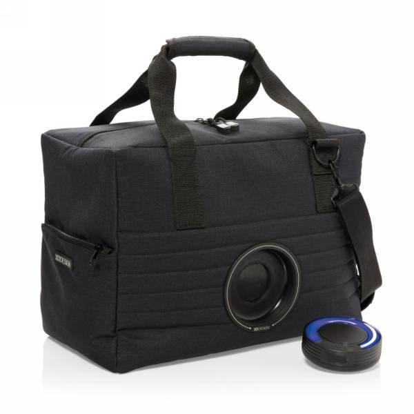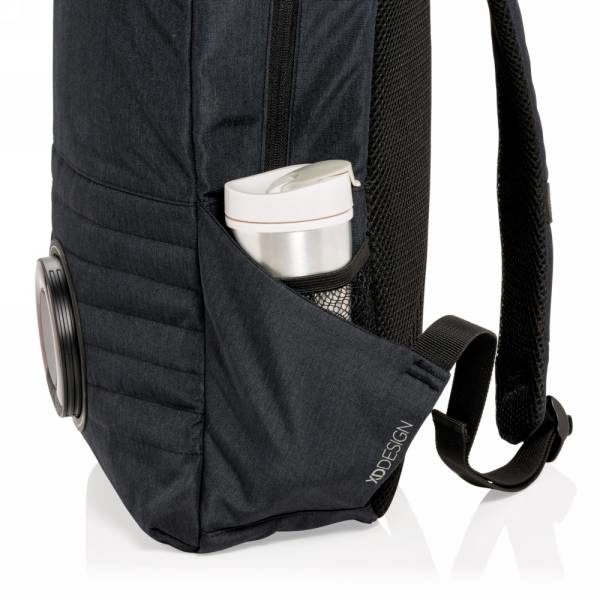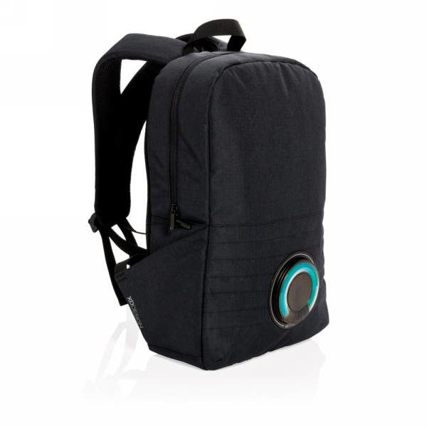 Trendy 15” laptop backpack with removable waterproof IPX5 wireless speaker with colour changing LED. Connect your powerbank easily to the integrated USB charging port and charge your phone or tablet on the go. Simply twist and take out the speaker to place it on your desk. 5 hour playtime. Registered design®