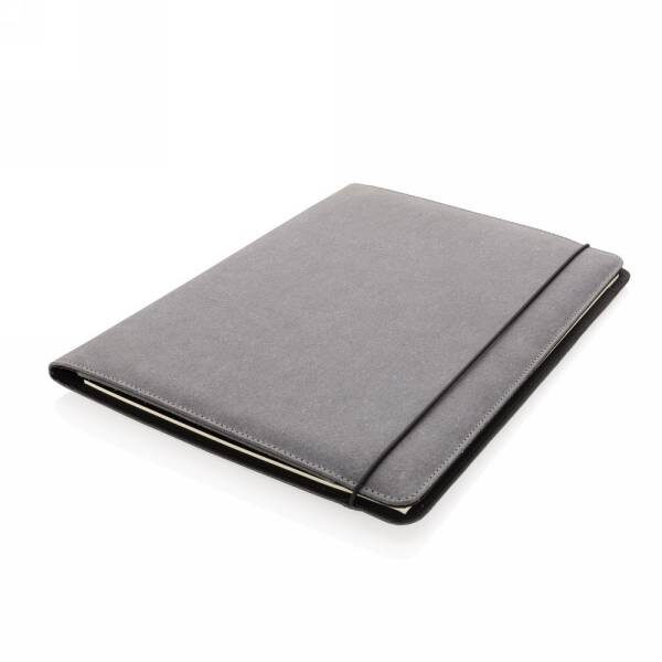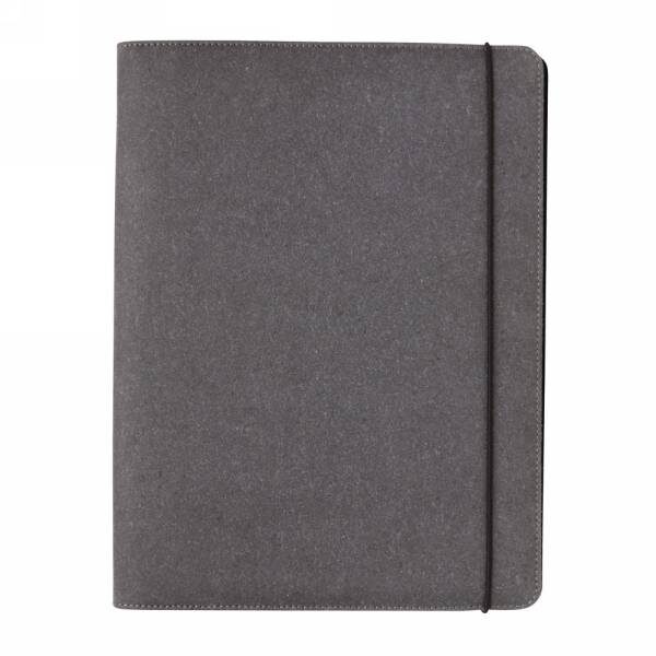 The recycled leather portfolio adds a little bit of extra sophistication to your work. Keep your important documents, cards and notes together in this beautiful portfolio with black elastic binder. Inside the A4 portfolio you can find a lined 64 gm/2 recycled paper notepad containing 20 pages. Inside there’s 1 big sleeve pocket, 3 phone size pockets and 4 business card slots.