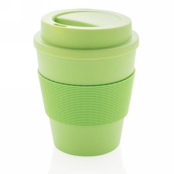 Stop single use! Bring your own cup and join the reuse revolution so you can contribute to a disposable free world. These lightweight and durable cups are perfectly suited to take your coffee on the go. These cups are reusable and made of 100% recyclable friendly PP material. The cups have a screw lid and a silicone sleeve. 100 degree Celsius food safe approved. Dishwasher and microwave safe. Content: 320 ml.