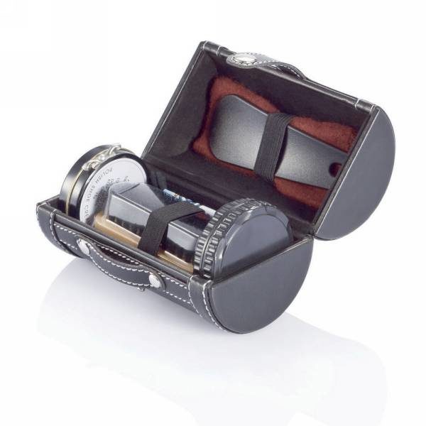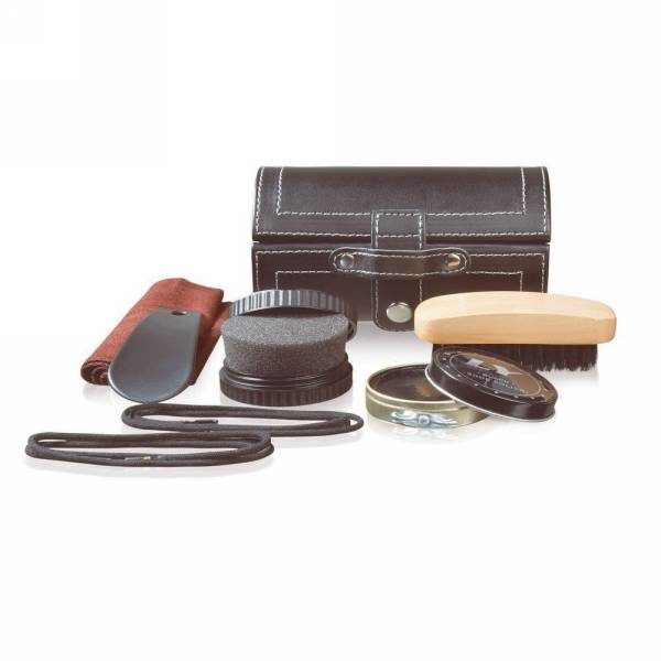 Shoe maintenance set in imitation leather case, including wooden shoe brush, neutral polish, soft cloth shine polish, shoehorn and one pair of black shoelaces
