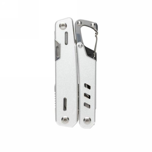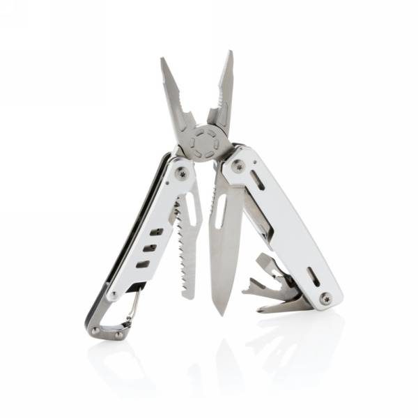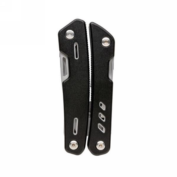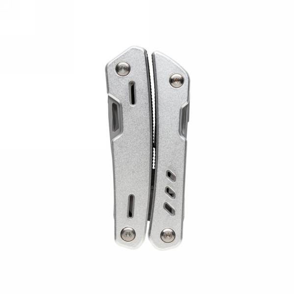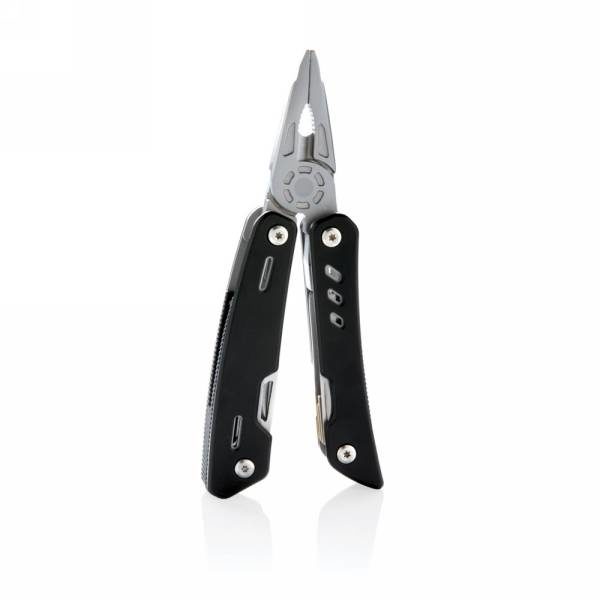 Strong and durable multitool with 12 functions. With aluminium case and stainless steel tools. Tools include: needle nose plier, regular plier, wire cutter, knife, phillips screwdriver, small flat screwdriver, saw, can opener, bottle opener, serrated knife, reamer/punch, file & large flat screwdriver. Packed in gift box.