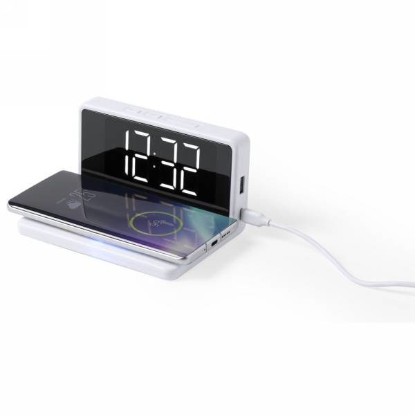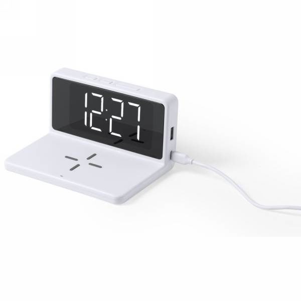 Wireless charger 5W with desk clock and alarm, calendar, works with mobile phones with inductive charging function, 3 light intensities, USB type C input 5V/2A, USB output 5V/1A, USB type C cable included