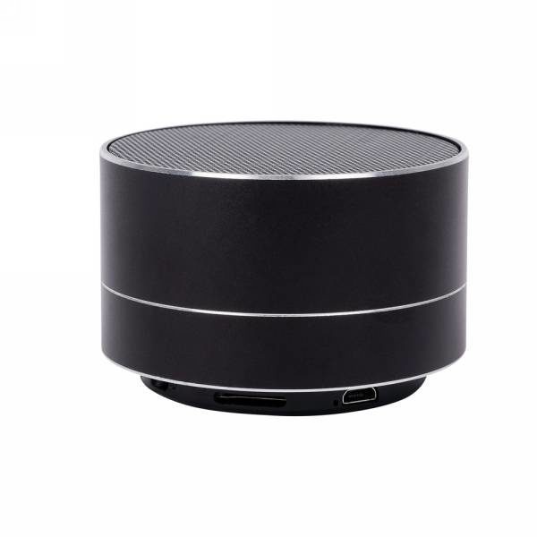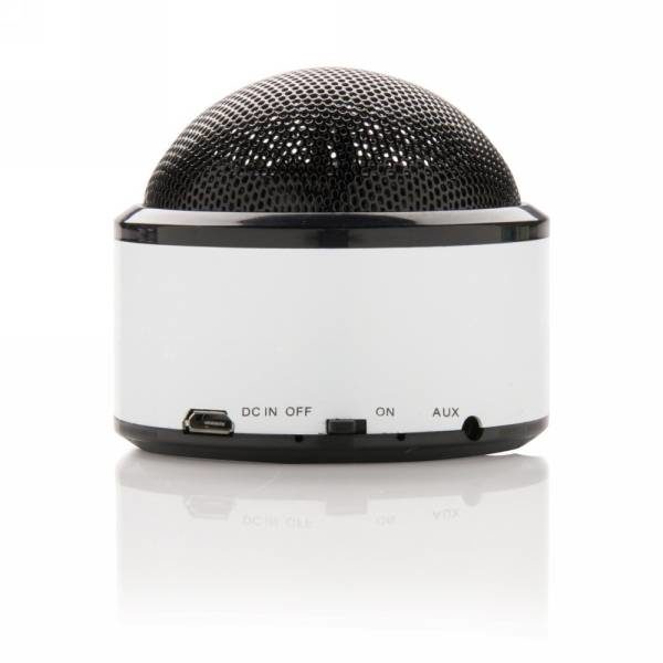 Wireless speaker with 3W speaker and 350 mAh battery. Because of its clever design the music will be played in all directions. Aluminium body and metal grill, the bottom of the speaker has rubber strips for improved sound quality and grip. Playing time up to 3 hours on one single charge and connection distance up to 10 metres. Includes micro cable to charge the speaker the device to your mobile phone without wireless connection. Compatible with all mobile phones.