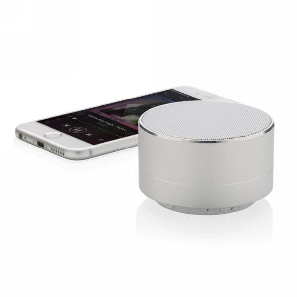 Aluminium 3W speaker with built-in 300 mAh lithium battery. With playing time up to 4 hours on one single charge and operating distance of 10m. Including ambient blue light on the bottom. With pick up function to answer incoming calls.