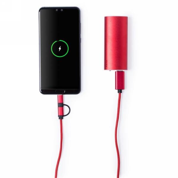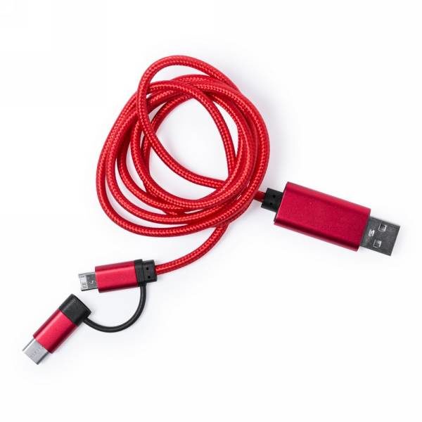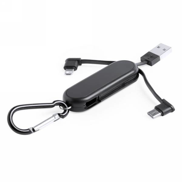 Charging cable with 3 plugs: USB, USB type C and 2 in 1 plug (micro USB and compatible with iOS devices), backlit surface after engraving, 1 LED, with carabiner hook