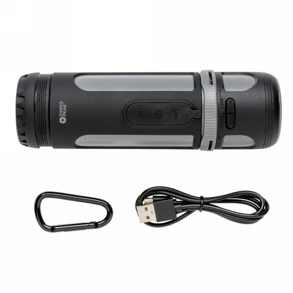 Unique 4 in 1 outdoor tool with powerbank, wireless speaker, camping light and torch. The 3W wireless speaker can play up to 18 hours on one charge! Perfect to take along on long trips. The powerbank has a capacity of 4500 mAh with 5V/2A output and 2A input. The LED is very bright (200-250 lm) and suitable for use in outdoor situations. The torchlight can be adjusted into 4 modes (normal, strong, weak and flashing) Comes with carabiner to hang the item for example on your hiking bag.