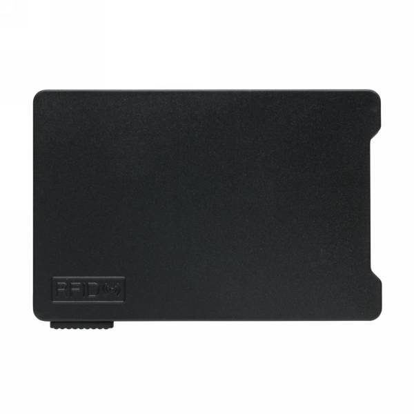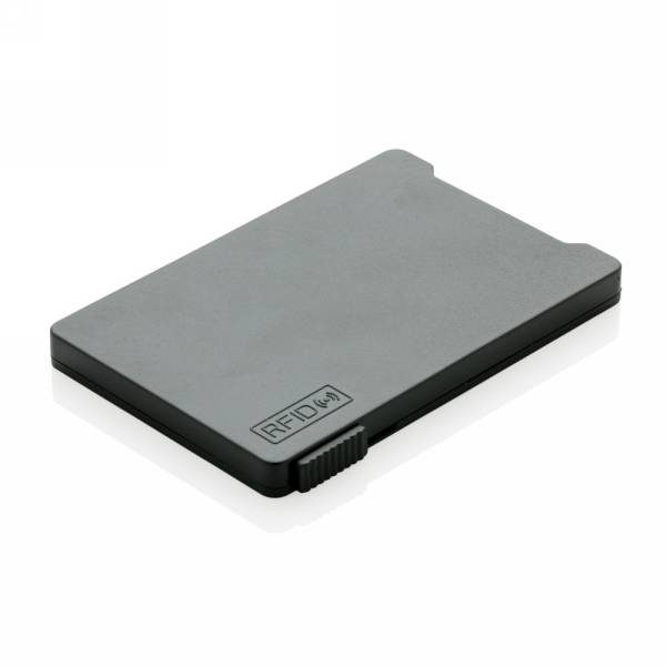 This card holder can hold a maximum of 4 cards or 3 embossed cards. Its designed to block RFID readers from electronic pickpocketing. The slider on the side will push the cards up. Registered design®