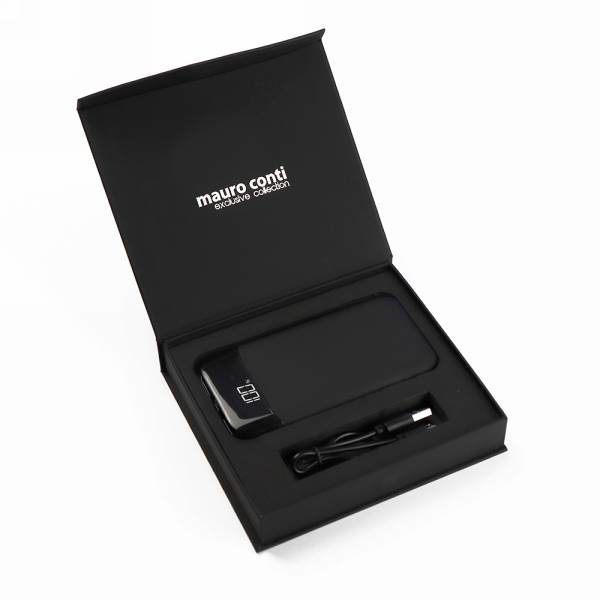 Mauro Conti power bank 8000 mAh, wireless charger 5W, works with mobile phones with inductive charging function, USB type C and micro USB inputs (max. 5V/2A), 2 USB outputs (max. 5V/2.1A), can charge two mobile devices simultaneously, digital display of power level, backlight effect after engraving, pouch and micro USB cable included, packed in gift box