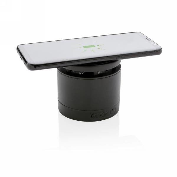 This charger combines listening to your favourite tunes with charging your phone wirelessly. Simply connect the included 150 cm micro to your USB charger at home or in the office and you are ready to go. It contains a 3W wireless speaker and a 5W wireless charger. The speaker has a 400 mAh battery and BT 4.2 that allows a playtime up to 3 hours and operating distance up to 10 metres. When using both functions make sure the item is connected to a power source. Wireless charging compatible with all QI enabled devices like Android latest generation, iPhone 8 and up. Input: 5V/1A, Wireless output: 5V/1A 5W. Registered design®