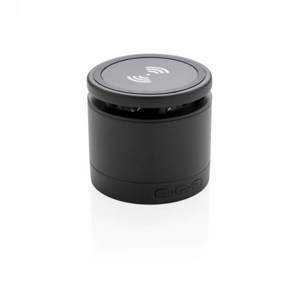 This charger combines listening to your favourite tunes with charging your phone wirelessly. Simply connect the included 150 cm micro to your USB charger at home or in the office and you are ready to go. It contains a 3W wireless speaker and a 5W wireless charger. The speaker has a 400 mAh battery and BT 4.2 that allows a playtime up to 3 hours and operating distance up to 10 metres. When using both functions make sure the item is connected to a power source. Wireless charging compatible with all QI enabled devices like Android latest generation, iPhone 8 and up. Input: 5V/1A, Wireless output: 5V/1A 5W. Registered design®