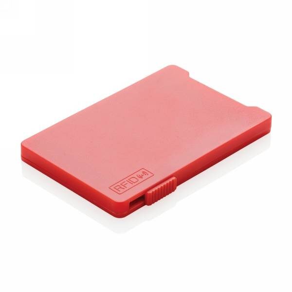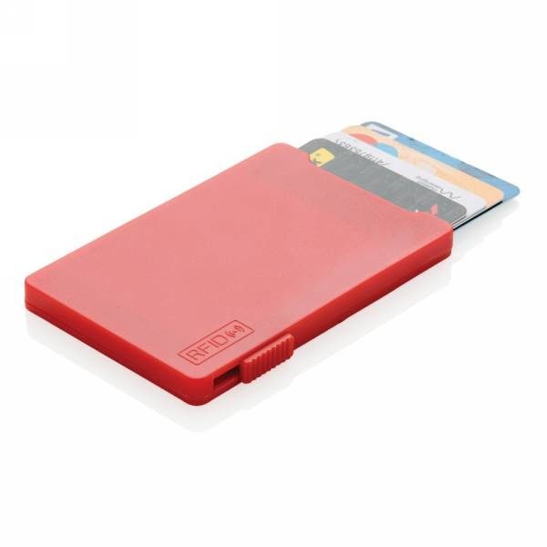 This card holder can hold a maximum of 4 cards or 3 embossed cards. Its designed to block RFID readers from electronic pickpocketing. The slider on the side will push the cards up. Registered design®