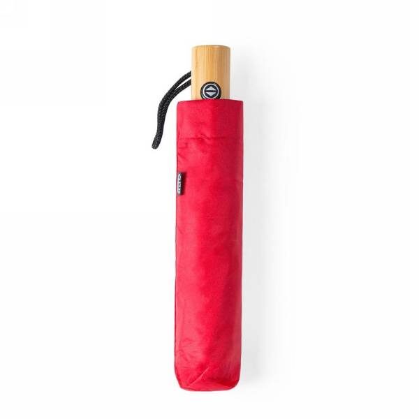 Automatic umbrella, made of RPET, wooden handle with matching colour wrist cord, 8 panels, velcro closing, pouch included