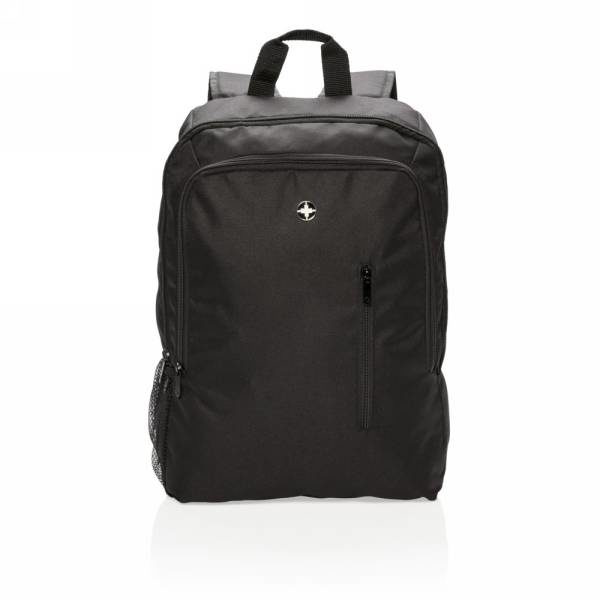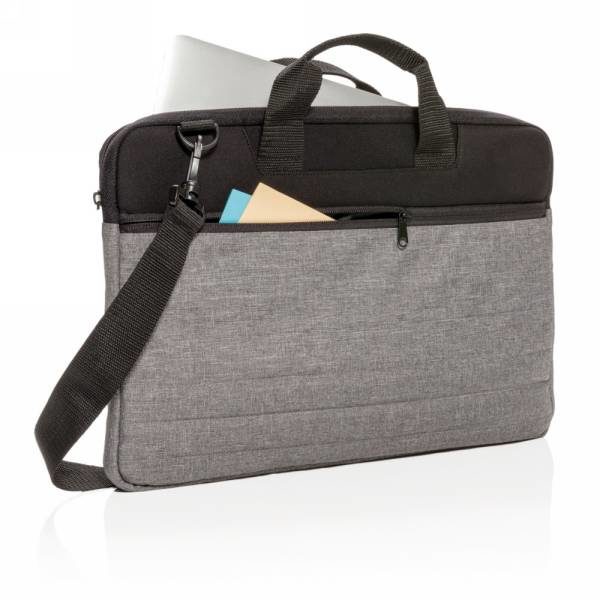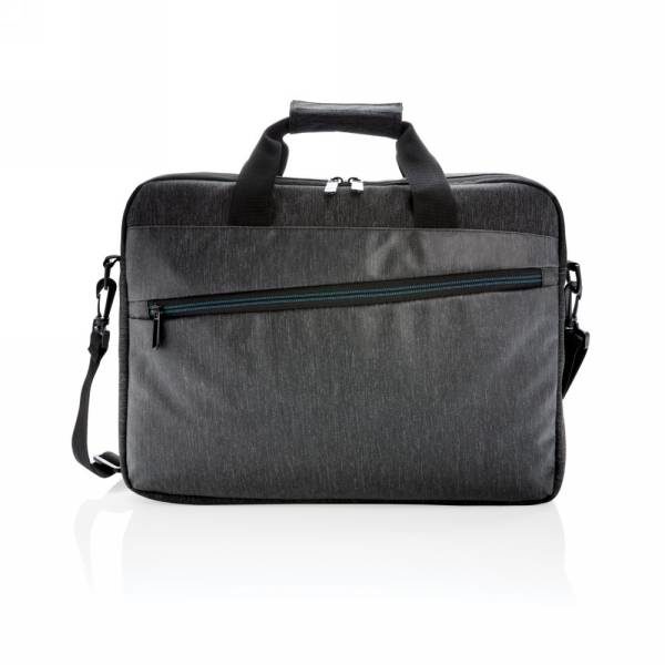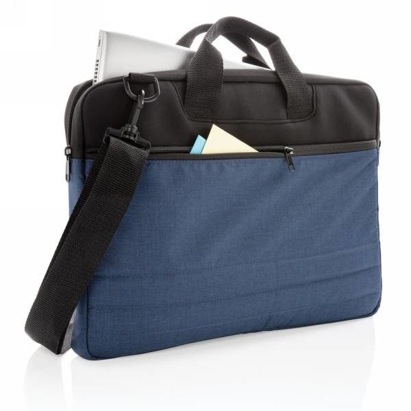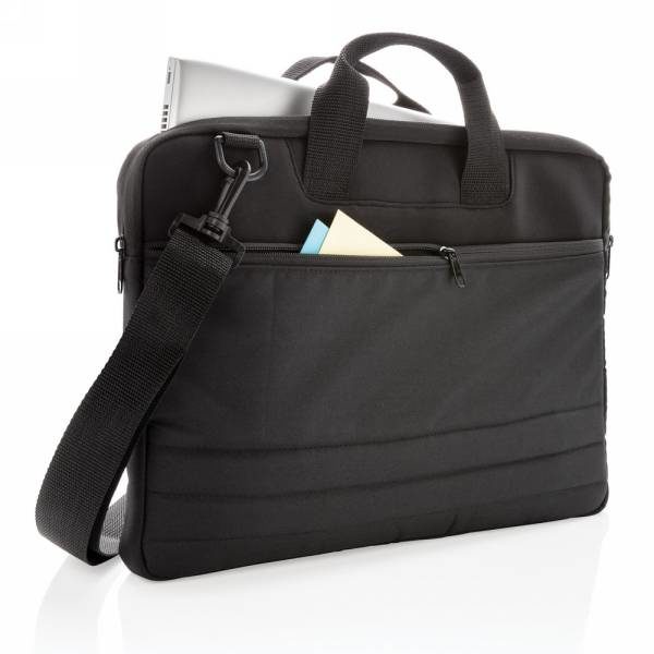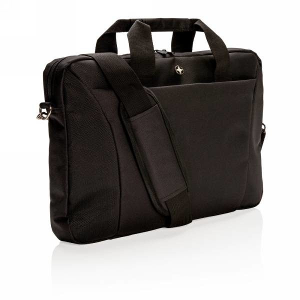 Carry your 15.4” laptop to and from work inside this slim 600D with 1680D polyester laptop bag from Swiss Peak. Includes a padded pocket for your laptop, a separate pocket to hold your iPad or tablet, and a front zippered extensive organizer with pen sleeves and pockets to hold all of your small accessories. Also comes with a rear luggage opening that can be slid over the handle of your upright rolling suitcase. Versatile carrying options with the adjustable & detachable shoulder strap. PVC free.