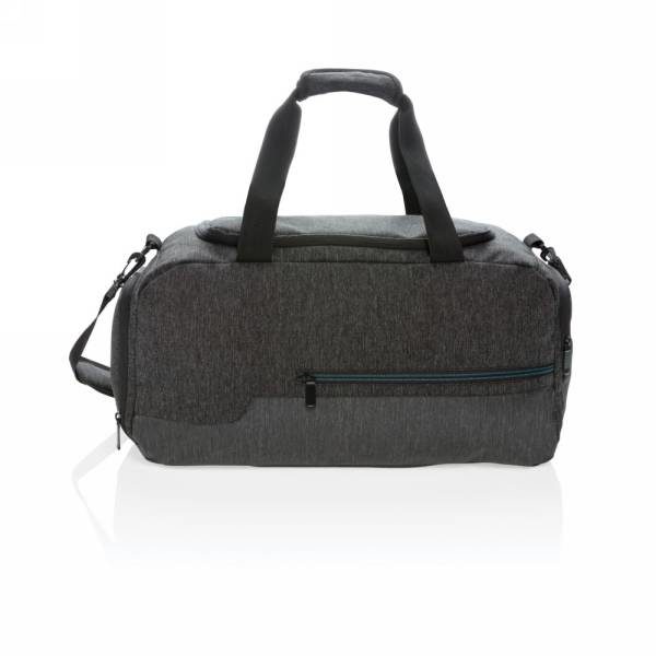 This 900D comfortable sized duffle bag is perfect for every active adventure and workout at the gym. It's made from durable polyester fabric and features water resistant coating material to protect against dirty gym floors or wet fields. Detailed with reinforced handles and a padded shoulder strap that offers a versatile carrying option. This duffle features a roomy main compartment with an inside zipper pocket to hold cash or valuables plus a breathable pocket for your shoes. A front zipper pocket with convenient storage for your cell phone, keys and other frequently used accessories. PVC free.