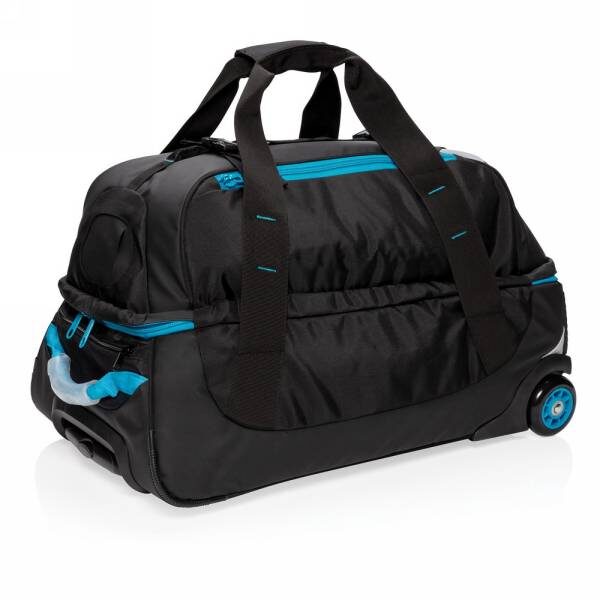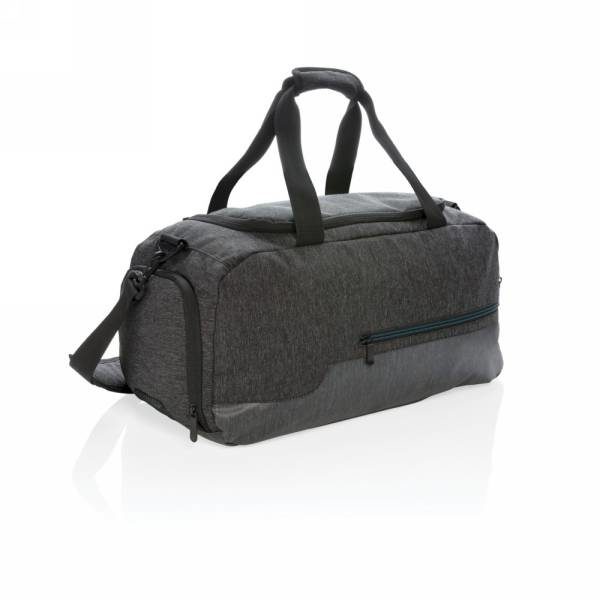 This 900D comfortable sized duffle bag is perfect for every active adventure and workout at the gym. It's made from durable polyester fabric and features water resistant coating material to protect against dirty gym floors or wet fields. Detailed with reinforced handles and a padded shoulder strap that offers a versatile carrying option. This duffle features a roomy main compartment with an inside zipper pocket to hold cash or valuables plus a breathable pocket for your shoes. A front zipper pocket with convenient storage for your cell phone, keys and other frequently used accessories. PVC free.