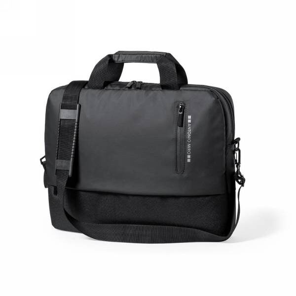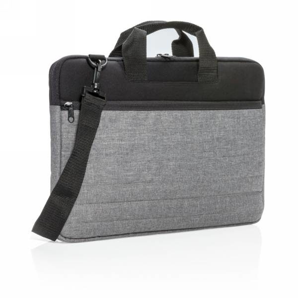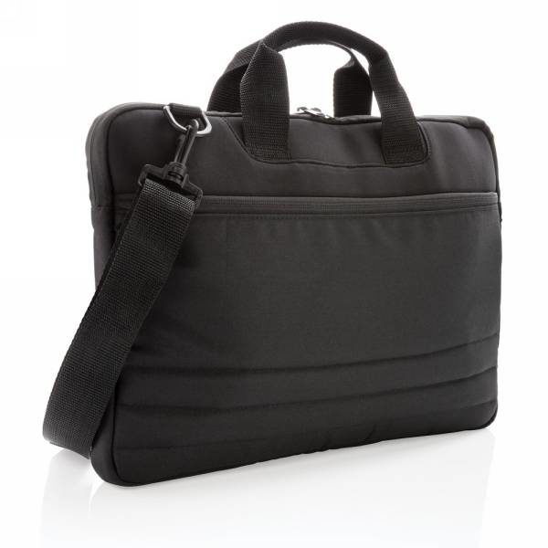 Carry your 15.4” laptop to and from work inside this slim 600D with 1680D polyester laptop bag from Swiss Peak. Includes a padded pocket for your laptop, a separate pocket to hold your iPad or tablet, and a front zippered extensive organizer with pen sleeves and pockets to hold all of your small accessories. Also comes with a rear luggage opening that can be slid over the handle of your upright rolling suitcase. Versatile carrying options with the adjustable & detachable shoulder strap. PVC free.