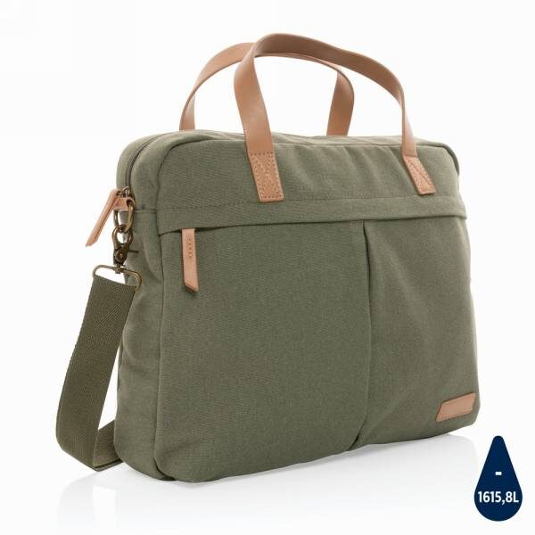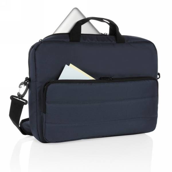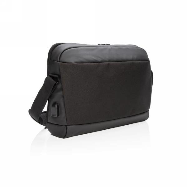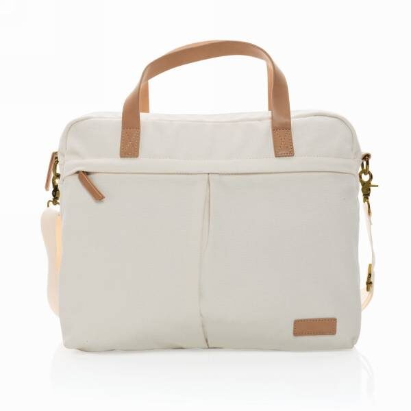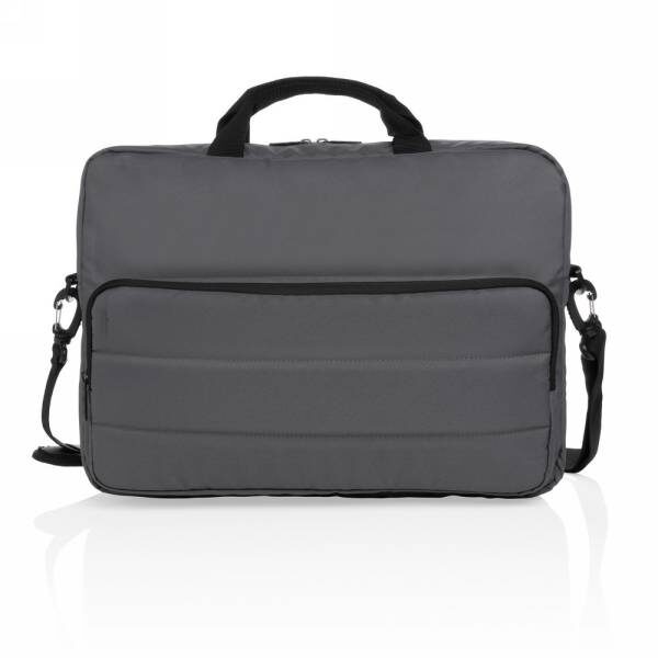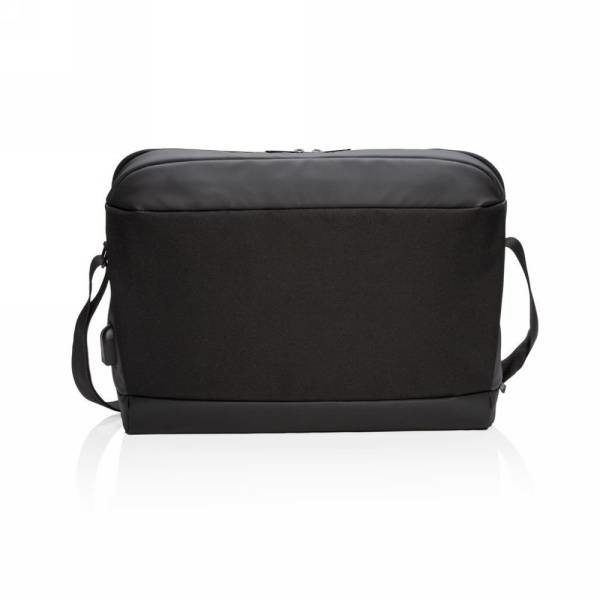 Fashionable 15” laptop bag two tone polyester with PU. Designed with one large main compartment for your laptop and one front compartment. Connect your powerbank easily to the integrated USB charging port and charge your phone or tablet on the go. With shoulder strap and trolley strap on the backside.