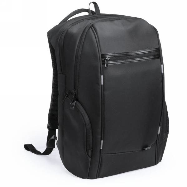 Unique 1680D polyester laptop backpack with two main compartments. One compartment contains a universal storage system to store almost any laptop size. The other compartment has a special storage pocket for your tablet. The front has two zipper pockets ideal for storing your smaller valuable belongings including a hook to hang your keys on.