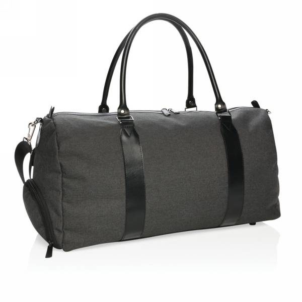 Modern and minimalist 600D polyester weekend bag with PU handles & comfortable shoulder strap. Large main compartment with plenty of room for your weekend necessities or sports gear. Connect your powerbank easily to the integrated USB charging port and charge your phone or tablet whilst on the go. Also comes with quick access pocket on the right. PVC free.