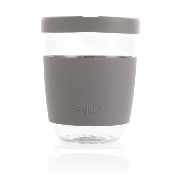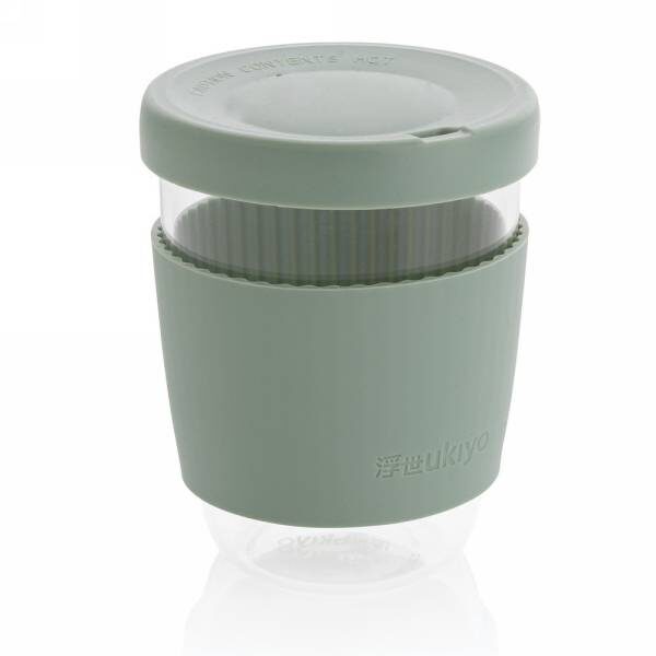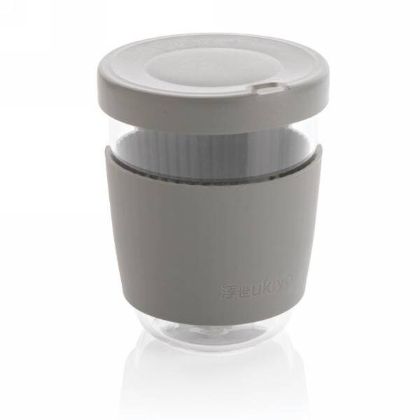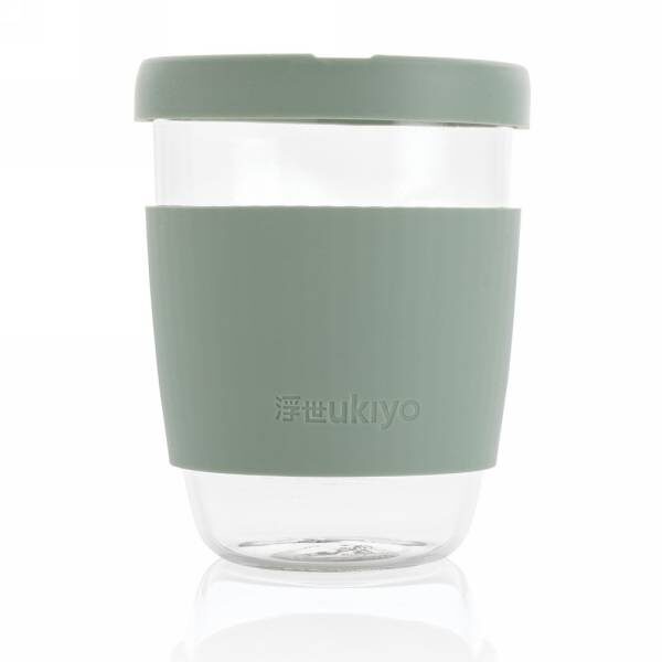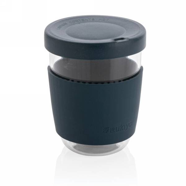 Enjoy your coffee at work or at home in this Ukiyo borosilicate glass with silicone lid and sleeve. The cup has a nice grip and a slim shape. A small vent in the lid allows steam to escape to prevent pressure build-up. BPA free. Capacity 360ml.