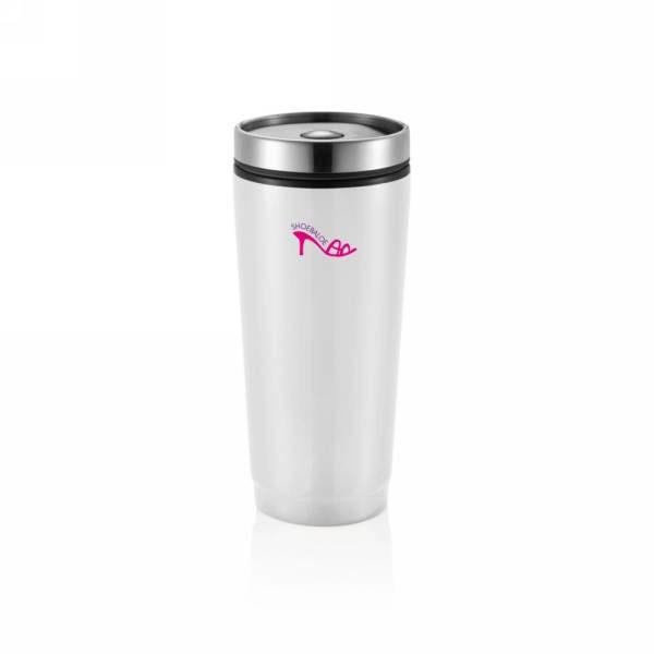 370 ml stainless steel outside and PP inside tumbler with screw on lid and unique push button closure to prevent spilling. Suitable for single hand operation. Registered design®