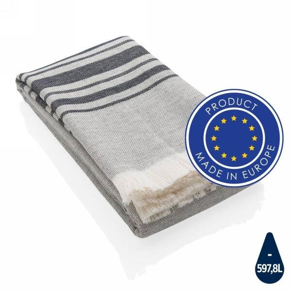 This lightweight, highly absorbent, sand-resistant, and quick dry towel is one of the best sustainable towels out there. Hammam towels are multifunctional: you can also use it as a picnic, baby blanket or as a yoga, beach, and gym towel. Even as a table cloth. Best of all, the thin material makes it ultra-portable and easy to toss in your beach bag, suitcase or over your shoulder. It's made from 88% OEKO-TEX-certified cotton (No harmful substances or dyes are used during the manufacturing process.) and 12% recycled cotton that's super soft and silky to the touch. With AWARE™ tracer that validates the genuine use of recycled cotton. Each towel saves 597,8 litres of water. 2% of proceeds of each Impact product sold will be donated to Water.org. Made in Europe