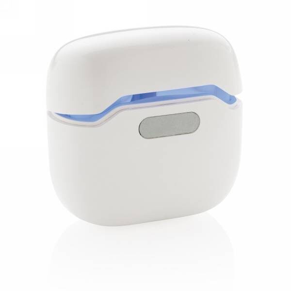 Studies show that the average earbud contains more bacteria than a cutting board. Still earbuds are taken in and out of the ear multiple times a day while containing various bacteria and without cleaning them. These unique design TWS earbuds are cleaned with UV-C light within the charging case eliminating up to 99,9% of the bacteria found on the earbud. The earbuds use BT 5.0 for easy auto pairing connection and low energy consumption. The earbuds allow a play time of 3 hours and can be re-charged in the 400 mah charging case. Operating distance up to 10 metres. UV-C wavelength 270nm-280nm. UV-C function will only work when the case is closed to avoid UV-C exposure to user. Including 1 extra pair of eartips. Including PVC free TPE material micro charging cable.