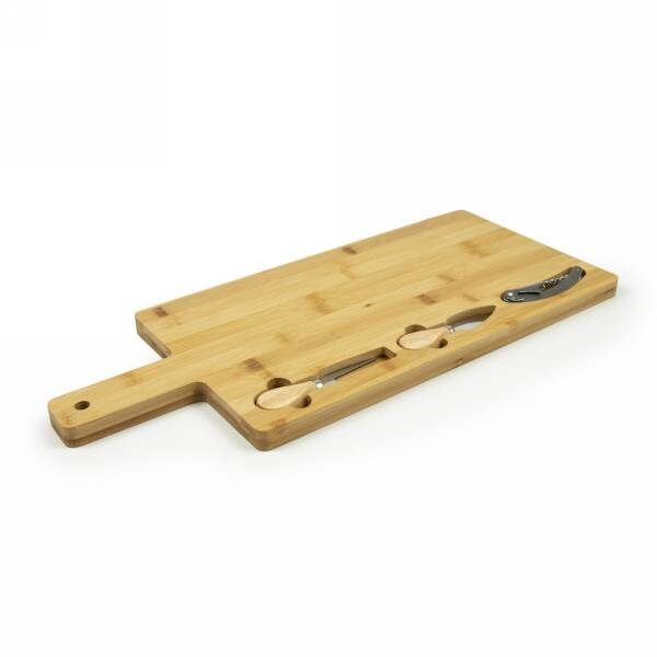 Cheese set, bamboo cutting board, cheese knife, fork and waiter's knife