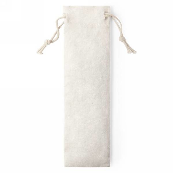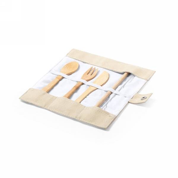 Bamboo cutlery, including spoon, fork and knife, in cotton pouch