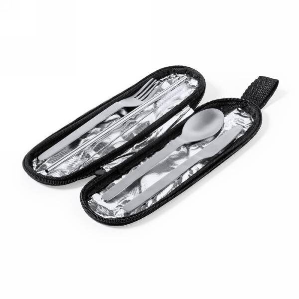 Stainless steel cutlery set, 5 pieces: knife, spoon, fork, reusable straw with cleaning brush, case included