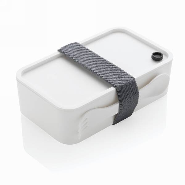 Lunchbox 1,4 L with cutlery: fork, knife, spoon, two compartments 700 ml, bamboo lid, combined with strap