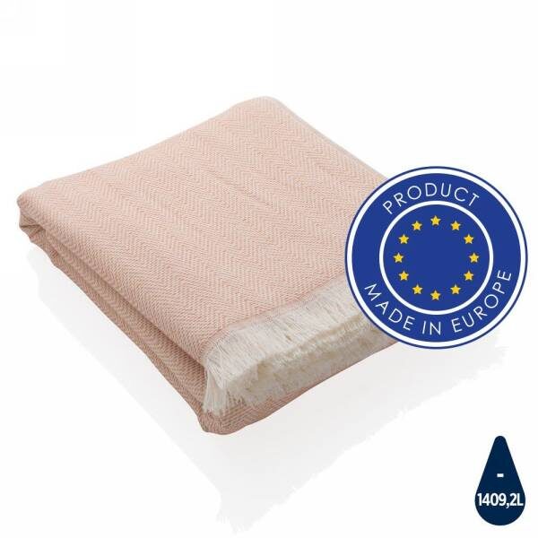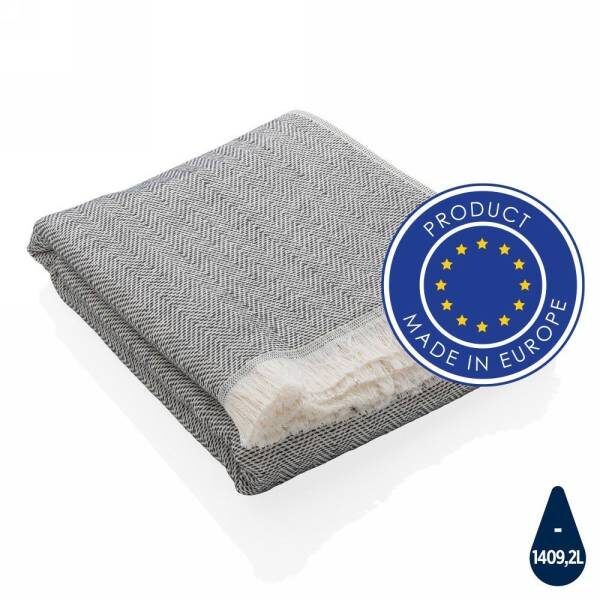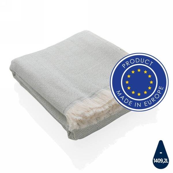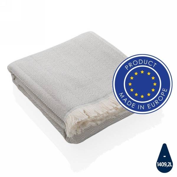 Our most luxurious and versatile towel. The perfect travel companion in any circumstance. It's made from 78% OEKO-TEX-certified cotton (produced without harmful substances or dyes) and 22% recycled cotton that's super soft and silky to the touch. With AWARE™ tracer that validates the genuine use of recycled cotton. You can use it for almost anything, such as the beach, travelling, sauna, swimming pool, camping, sports, as a beach towel, bath towel, scarf, pareo, yoga towel, blanket, as a wrap for your child - you name it. Perfect for sofas and dressing beds, the Hisako throws are also wonderful for sunbathing on or using as a machine-washable picnic blanket. These four seasons hammam towels are quick-drying, mould resistant and incredibly easy to clean making them a brilliant choice for allergy sufferers, red wine lovers and beachgoers. Each towel saves 1409,2 litres of water. 2% of proceeds of each Impact product sold will be donated to Water.org. Machine washable. Made in Europe