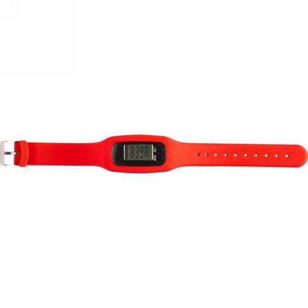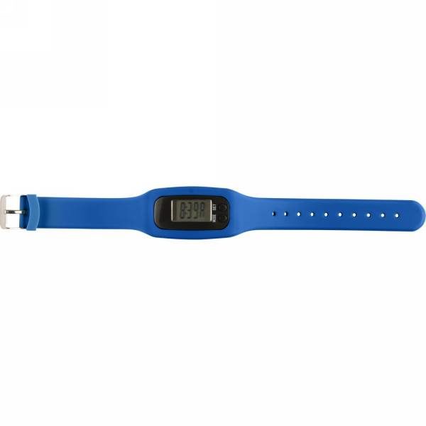 Pedometer bracelet with ABS pedometer unit and acrylic screen. The armband is made out of comfortable silicone material. The bracelet is adjustable to fit various wrist sizes and therefore suitable for all users. The bracelet counts steps, calories burned and distance travelled. Includes batteries for immediate use. Battery life on normal usage about 1 year.