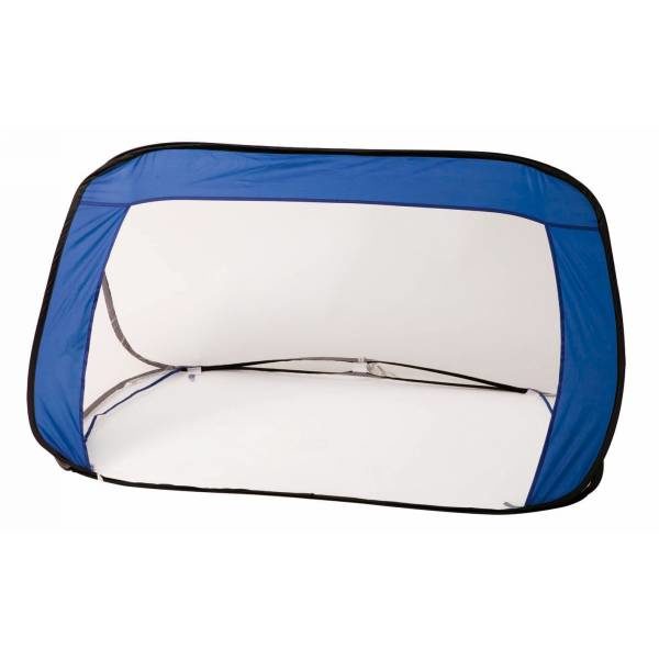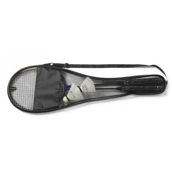 Badminton set, 2 rackets with steel frames and plastic handles, 2 shuttles, black mesh pouch with shoulder strap