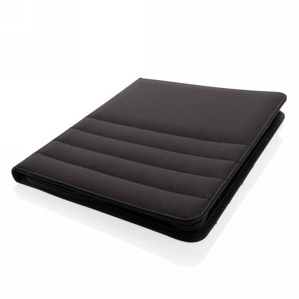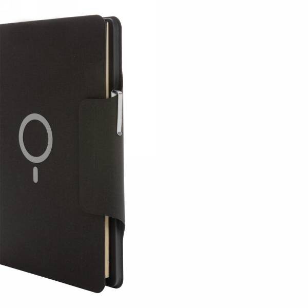 Open the Kyoto portfolio and you will see that an entire office can fit inside including your tablet (which you can also stand upright) . Includes 4000 mAh wireless powerbank. Compatible with all QI enabled devices like Android latest generation, iPhone 8 and up. Input: 5.0V/1.0A. Output: 5.0V/2.1A. Wireless Output: 5W. Made from rPET (recycled PET bottles). Includes removable notebook 128 lined cream coloured pages of 80 g/m2. Registered design®