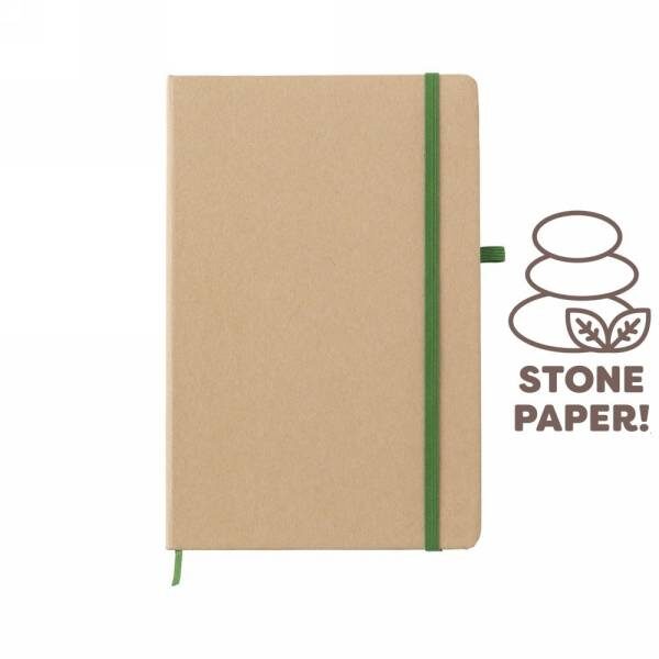 Notebook (approx. A5, 80 lined sheets made of stone paper), hard cover made of craft paper, elastic band for closing, pen loop. Stone paper is made of mix of 80% calcium carbonate and 20% HDPE, which makes it resistant to splashing, dirt and tearing. The product is environmentally friendly, because water and wood are not used during production.