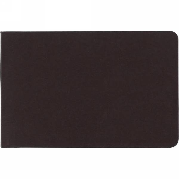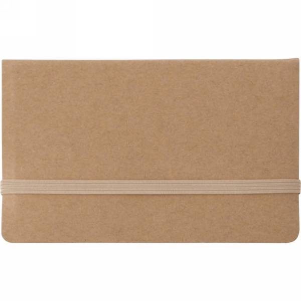 Case with 150 sticky notes, inside pocket for business cards and elastic band for closing
