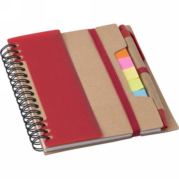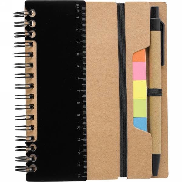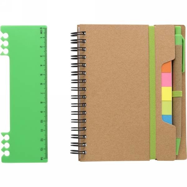 Memo holder, notebook (60 sheets of recycled, lined paper), ball pen, ruler, 125 sticky notes (25 pcs per colour), spiral binding