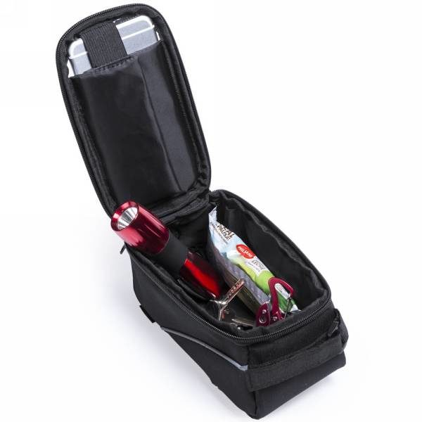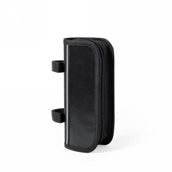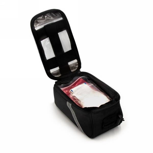 Blue pouch with reflective line on top, including 15 functions multitool with slotted screwdriver, cross-head screwdriver, nut driver, hex keys: 2mm, 2,5mm, 3mm, 4mm, 5mm, 6mm, wrenches: 8mm, 10mm, 15mm, spoke wrench: 14GE, sockets: 8mm, 9mm, 10mm, set with black plastic rack, 2 nickel plated crowbar, tube glue, grinder and 3 rubber patches.