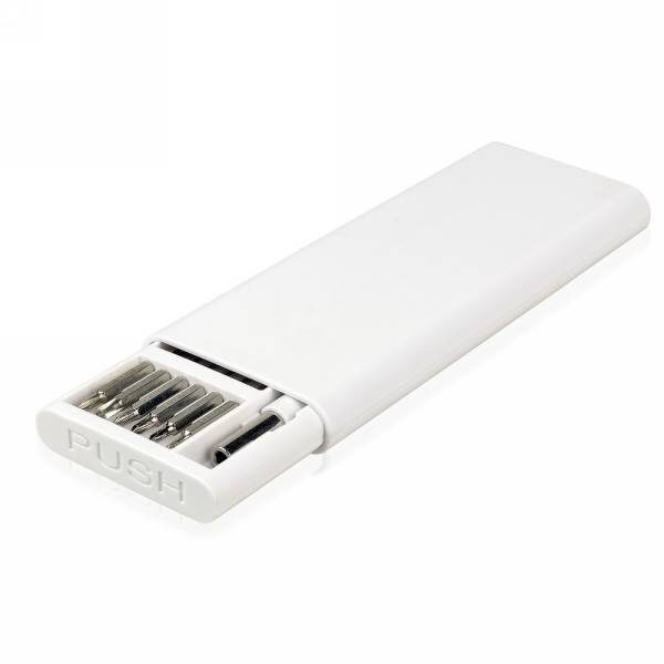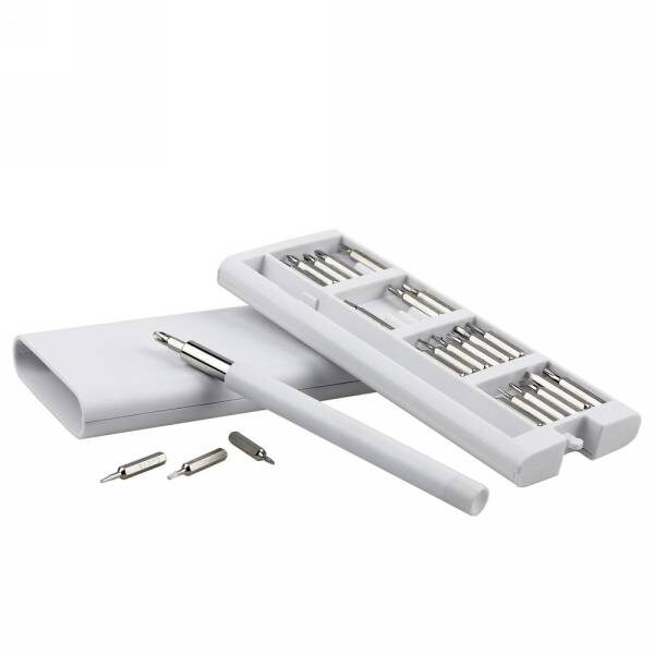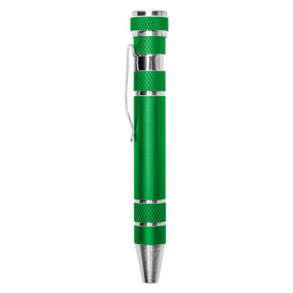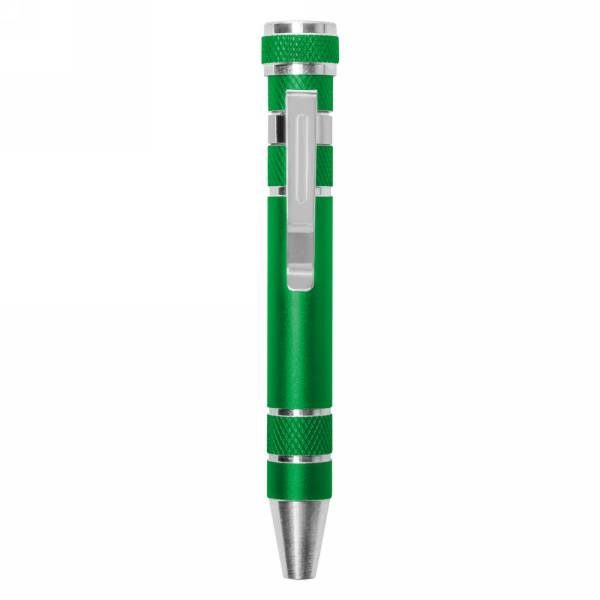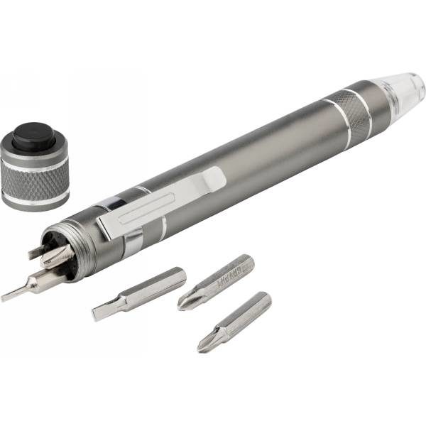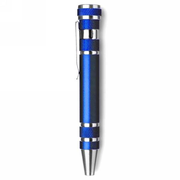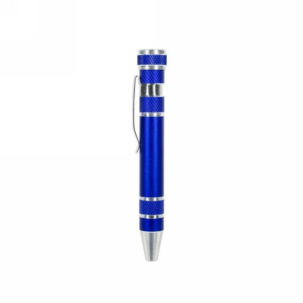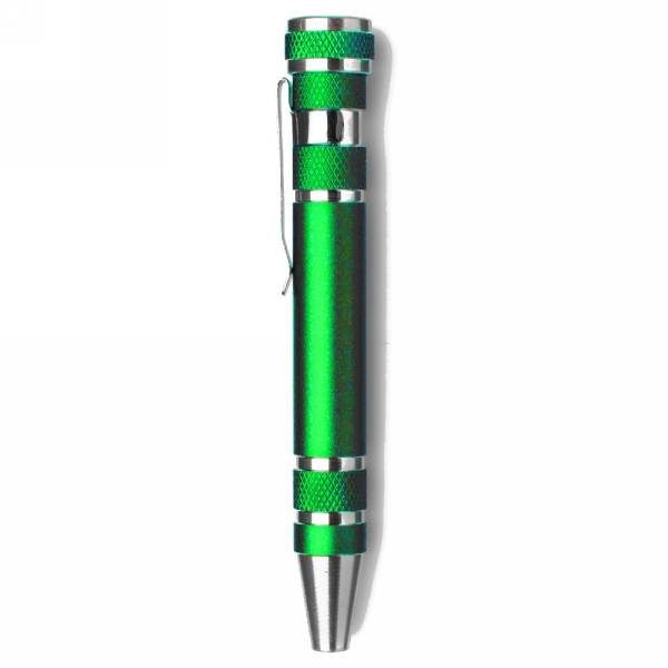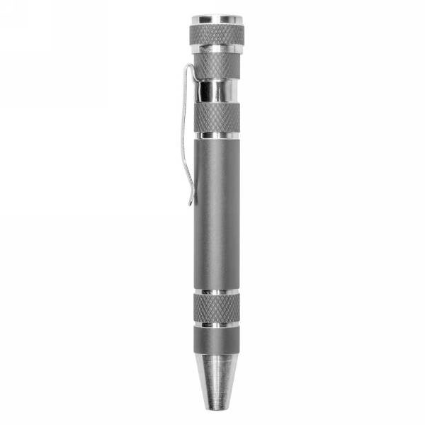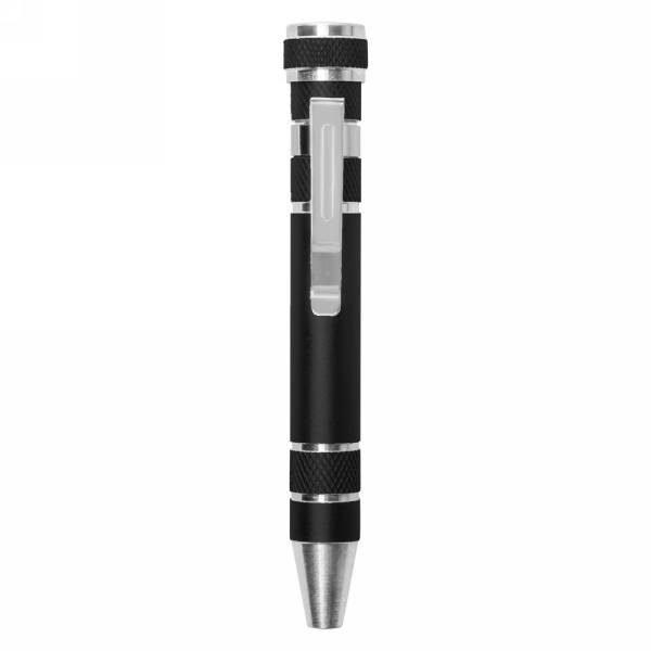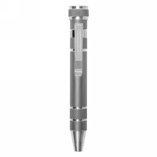 Pen shaped screwdriver with 4 flat head and 4 Philips screwdriver bits, with clip