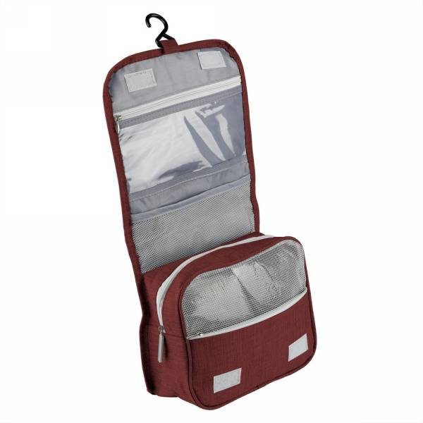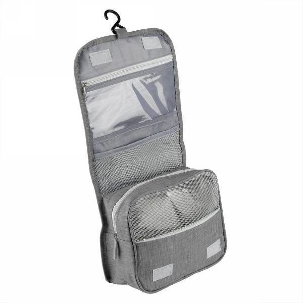 Cosmetic bag with numerous compartments, zipped main compartment, 1 mesh pocket, front and transparent pocket with zipper, hook for hanging included