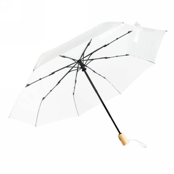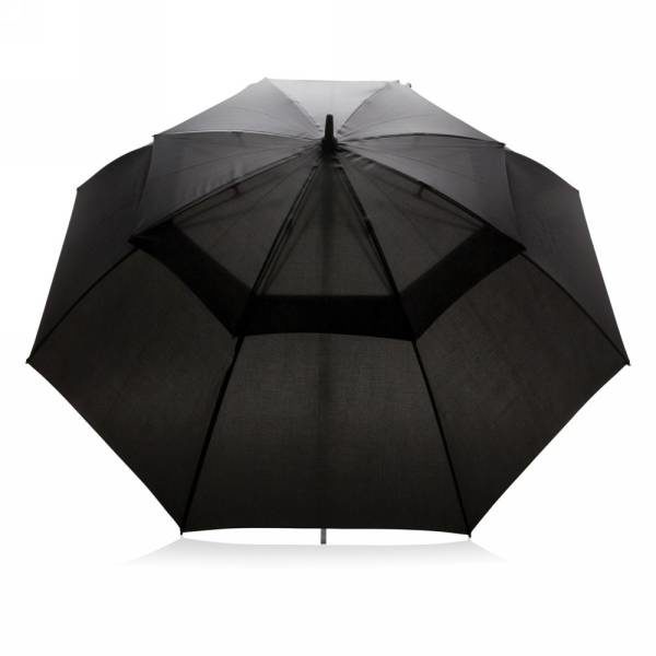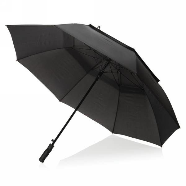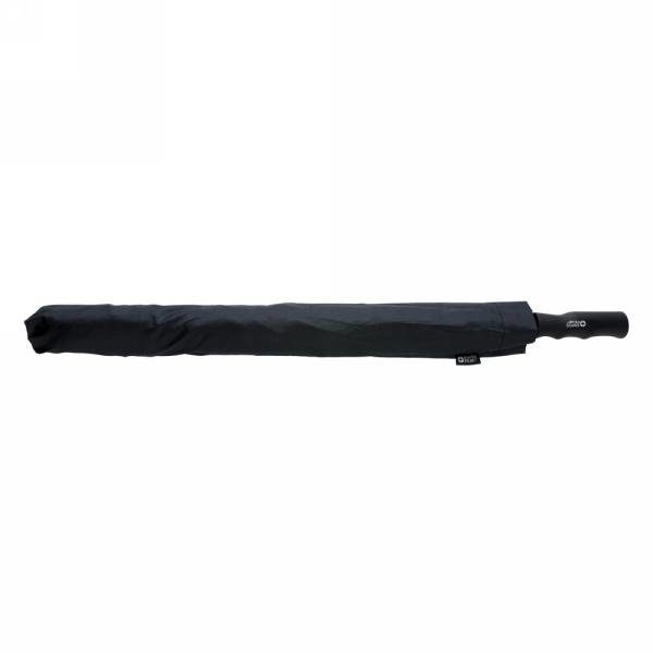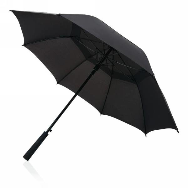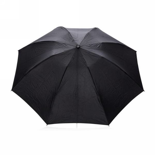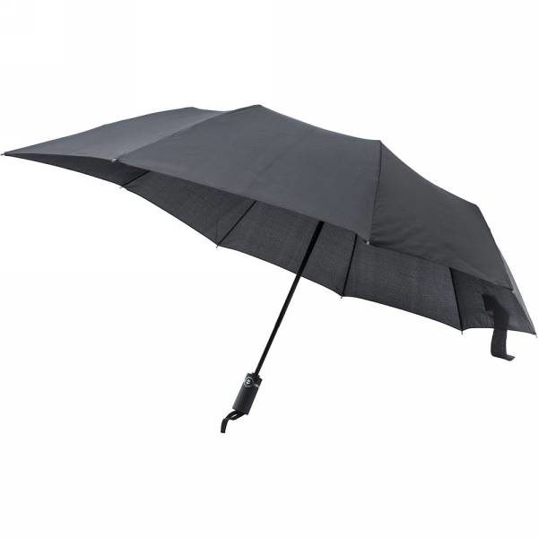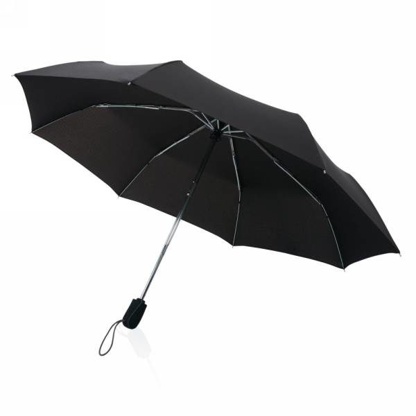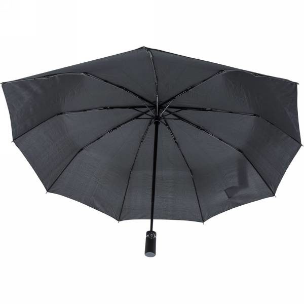 Folded; this umbrella is as light and small as a 23" size. Upon opening, the umbrella will automatically expand to a size of 27". This gives you more protection and makes it suitable for 2 people. Automatic open umbrella in 190T pongee polyester with metal shaft, fiberglass ribs, PP tips, matte black handle. With stormproof function.