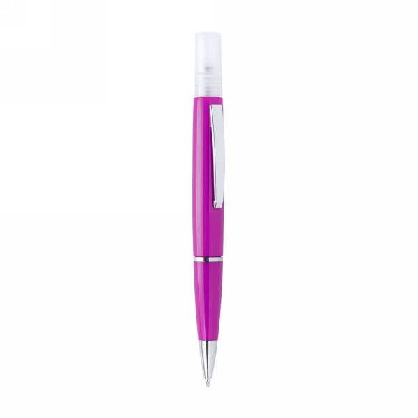 Ball pen with refillable atomizer (liquid not included) and cap, shiny finish and metal clip, spray capacity 3 ml
